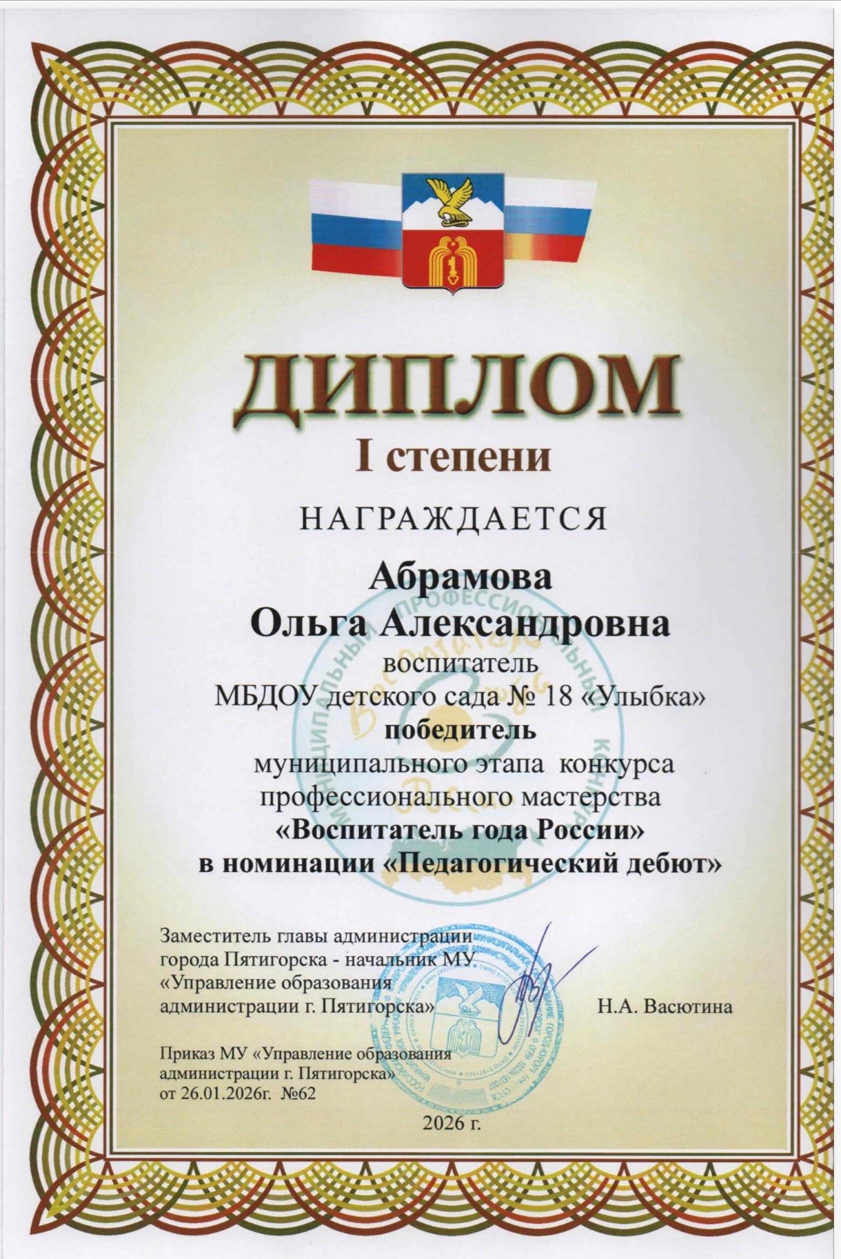 3 февраля студентка психолога-педагогического факультета Б-2Л группы Абрамова Ольга стала победителем муниципального этапа конкурса профессионального мастерства «Воспитатель года России» в номинации «Педагогический дебют».