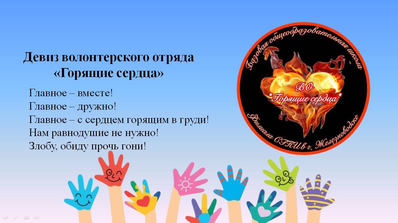Волонтёрский отряд «Горящие сердца» в Базовой общеобразовательной школе Филиала СГПИ в г. Железноводске— это объединение добровольцев, участвующих в творческой, социально полезной и значимой деятельности.